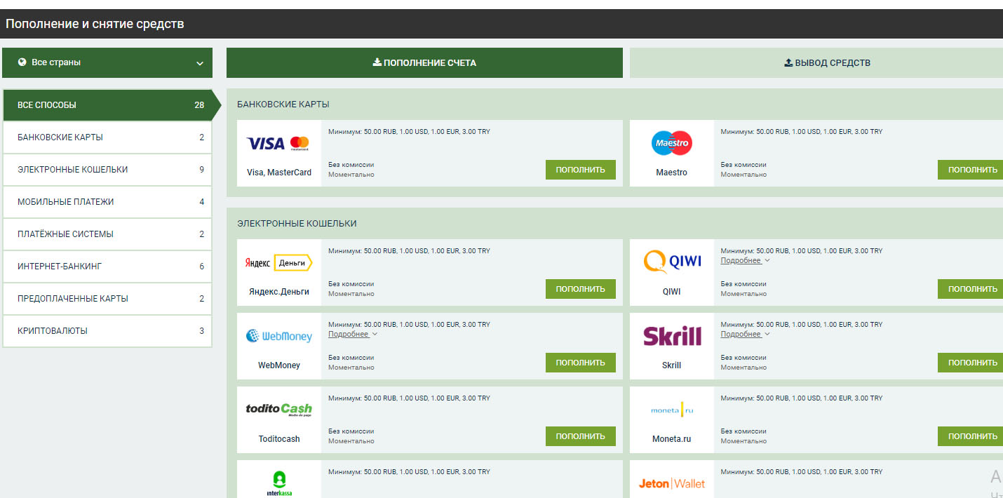 - рядом с каждым разделом находится кнопка «Пополнить», ее нужно нажать рядом с предпочтительным способом